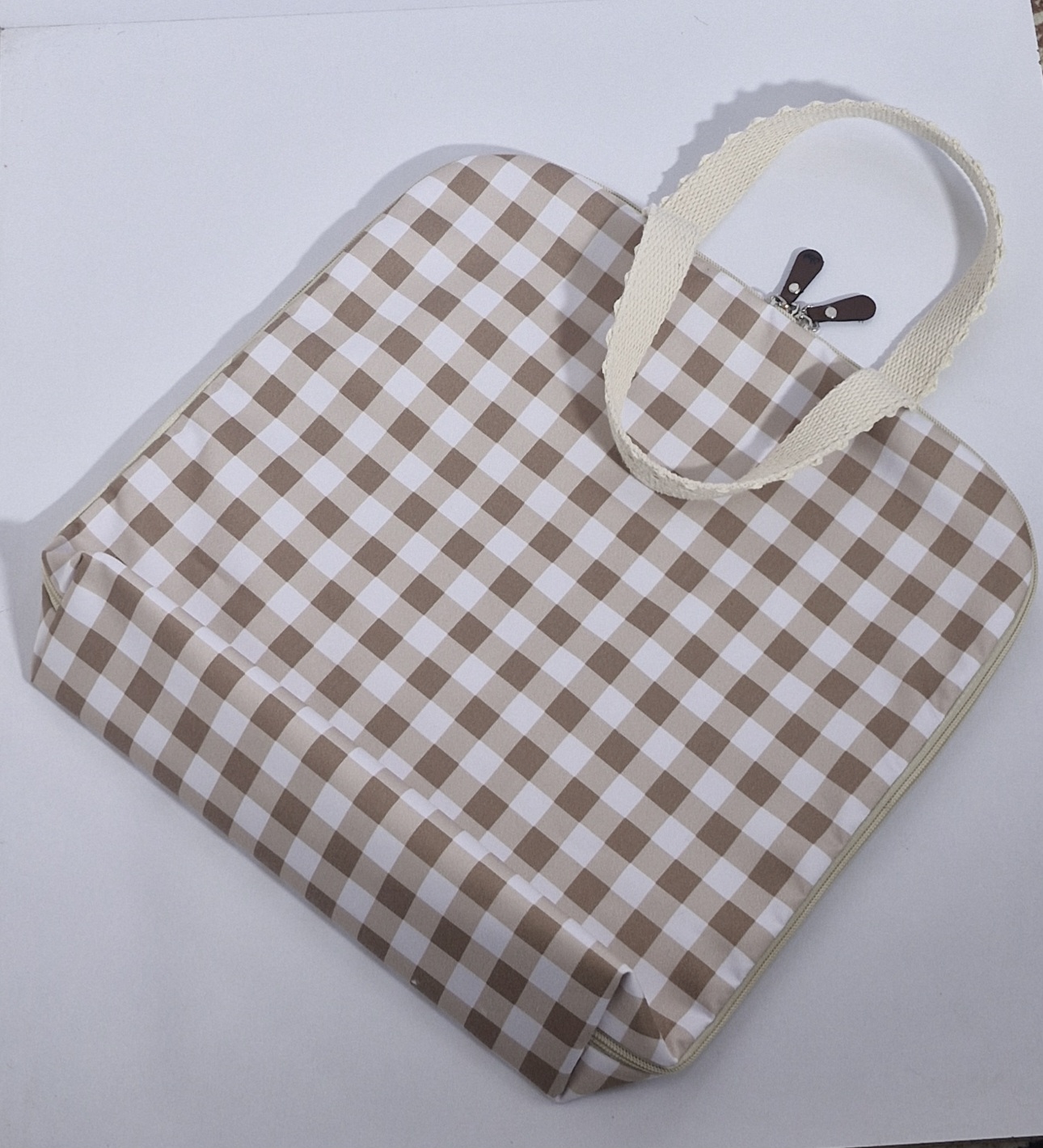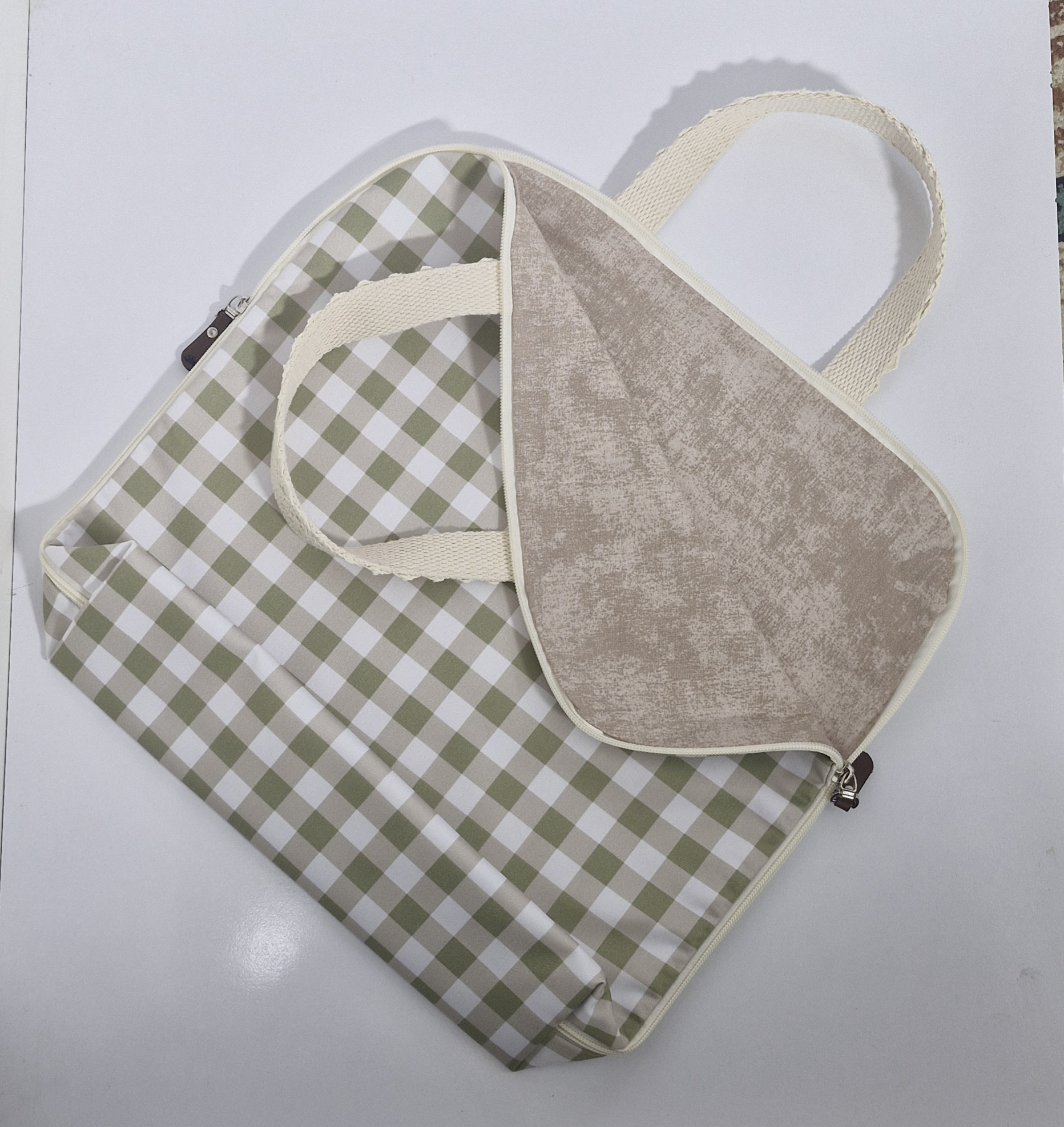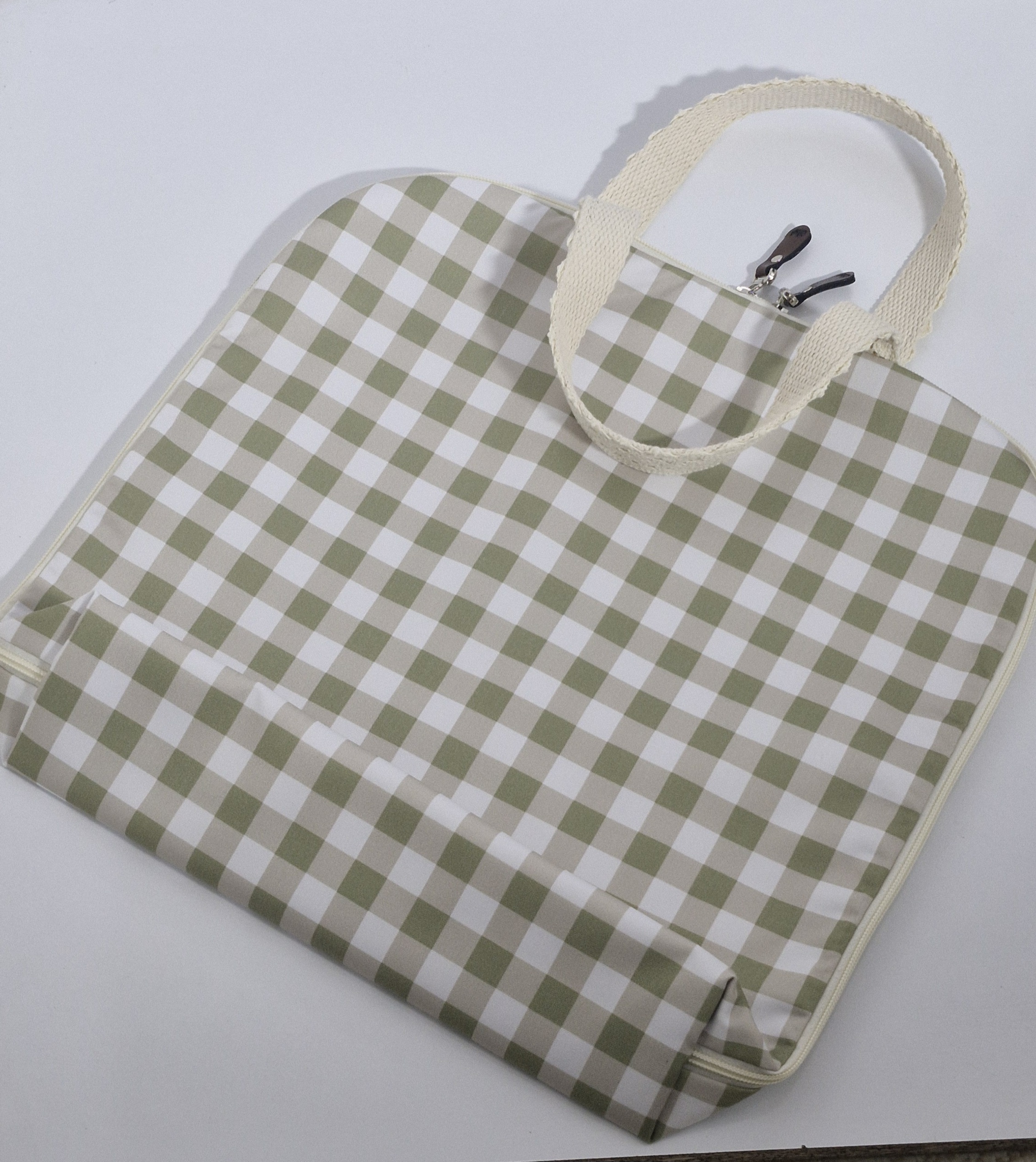کیف نون پارچهای دستدوز، ساختهشده از سهلایه مقاوم: فلامنت ضد وایتکس، برزنت ضدآب و کتان نخ.