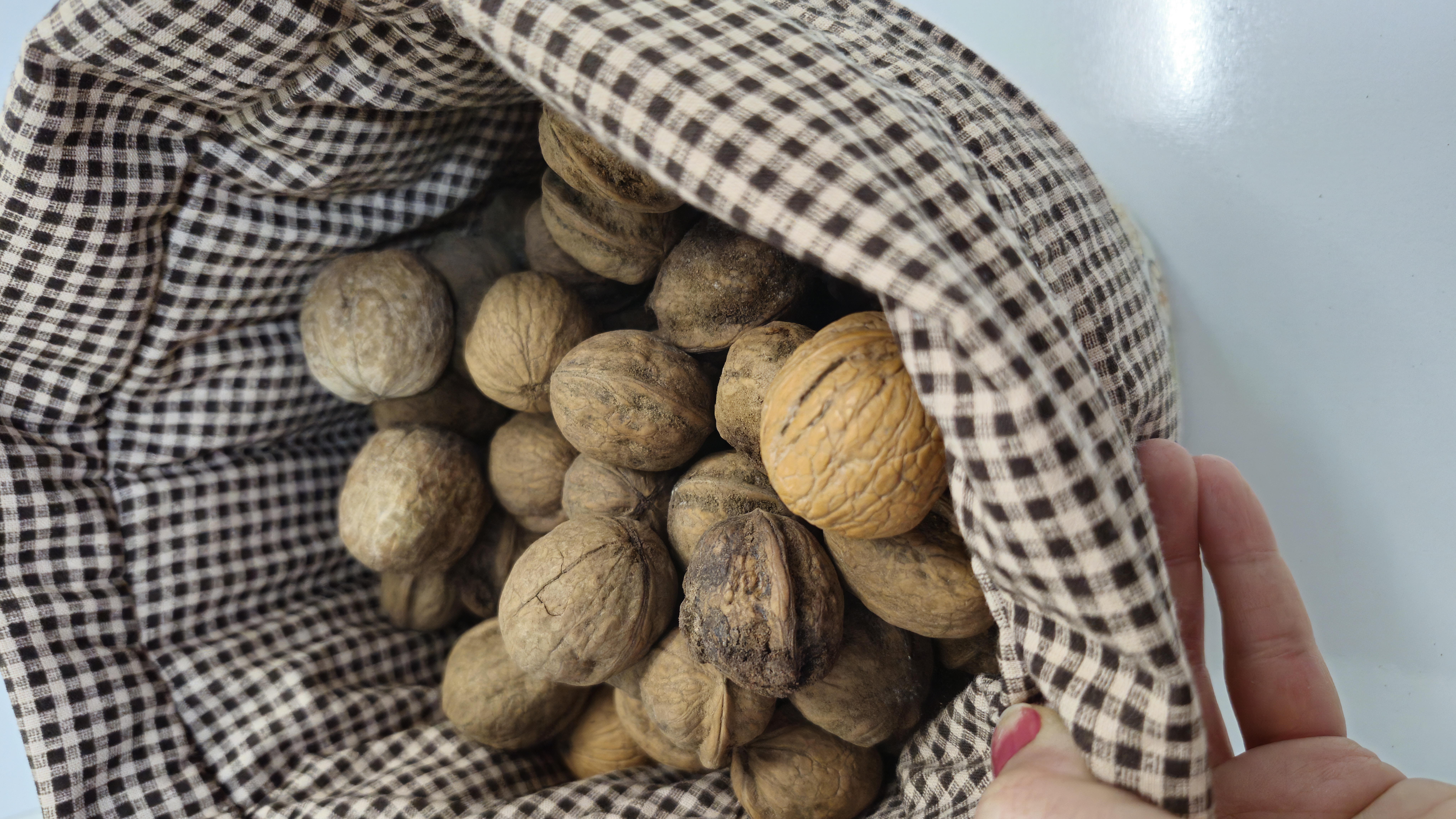 کیسه خشکبار دستدوز ایران با ترکیب متقال کتان ضخیم در لایه بیرونی و آستری کتان چهارخونه کرم–قهوهای در لایه داخلی ساخته شده است؛ آستریای که لک را نشان نمیدهد و همیشه ظاهر کیسه را تمیز نگه میدارد.